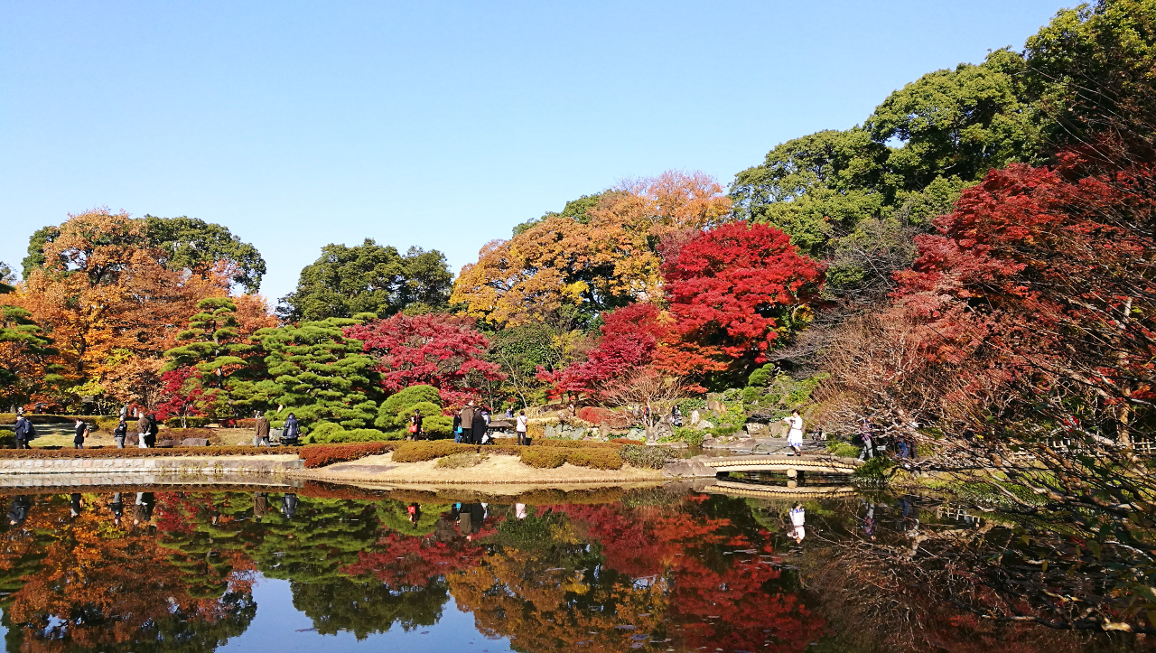 城跡なども皇居らしさを感じられ、庭園の水面に移る紅葉もまた見事。木々にも歴史を感じさせられますが、実は都会の中心にある場所ながらの、ビル群とのコントラストがあったりも。