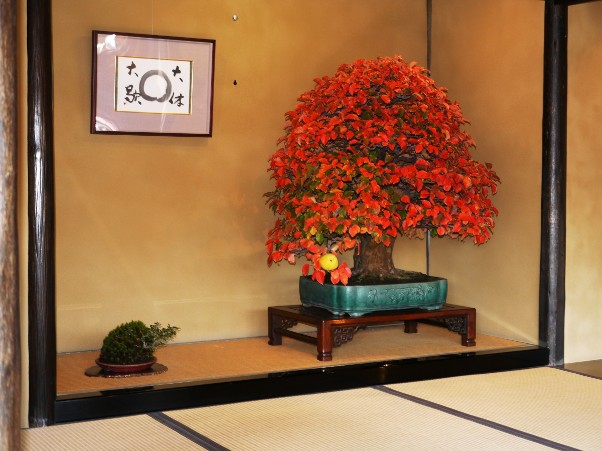 更には、「盆栽苑」と呼ばれるエリアもあり、日本家屋の床の間の盆栽や外に並べられた盆栽の中には紅葉しているものも。