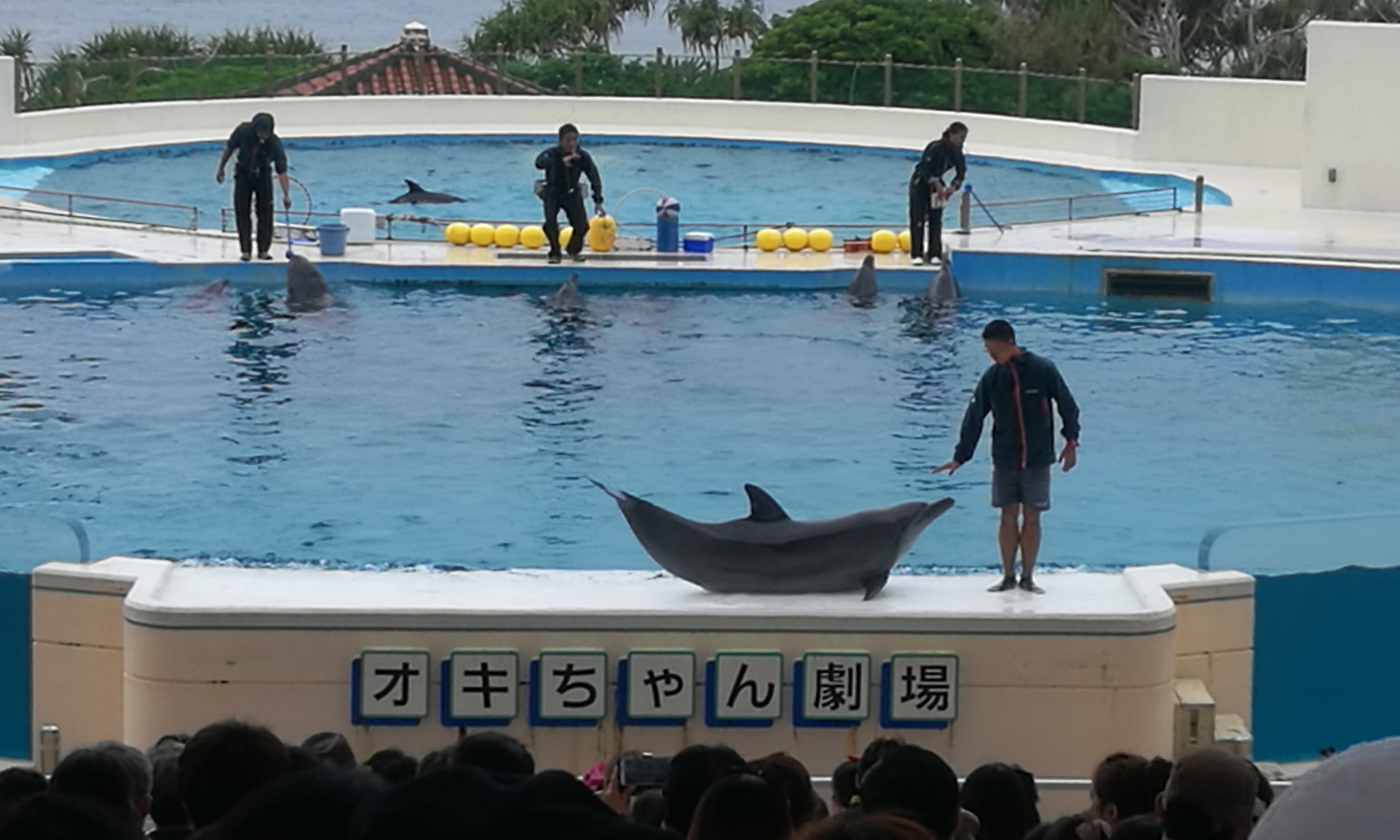 見事に人は殆どいませんでしたが…^^;) 園内を散策していたら、声が聞こえてきて..有料で時間がかかると思っていたイルカショー「オキちゃん劇場」が、なんと無料で開催されていました!
